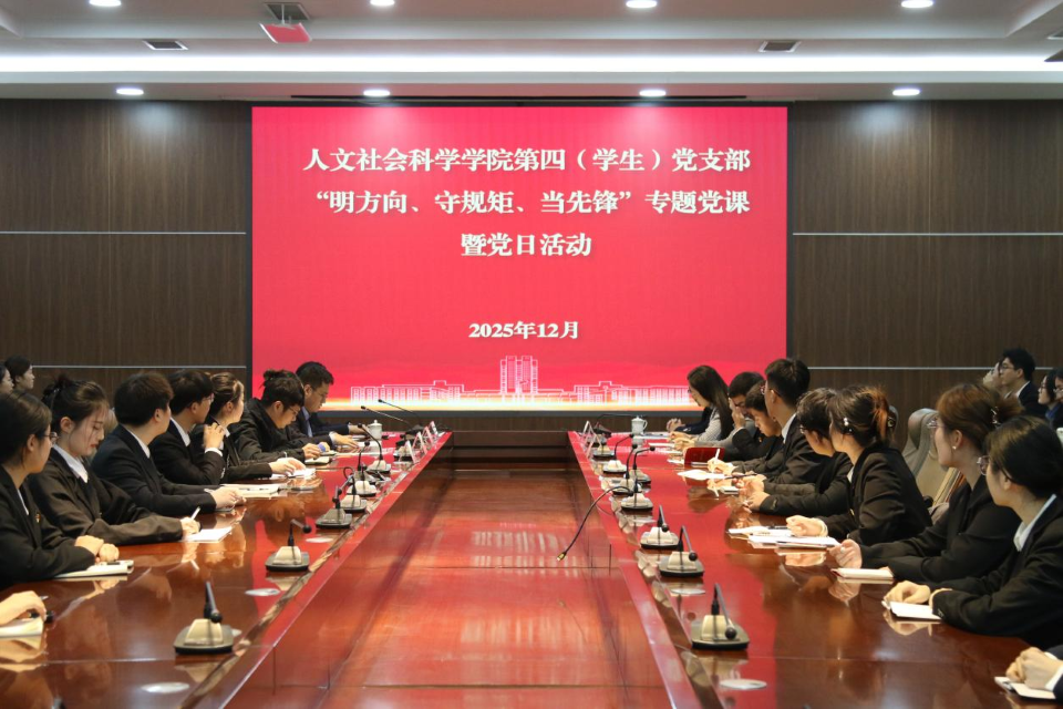 12月9日,人文社会科学学院第四(学生)党支部开展“明方向、守规矩、当先锋”专题党课暨主题党日活动。校党委委员、宣传部部长王峰,学院党委书记徐以师出席,人文社会科学学院第四(学生)党支部书记曹斯亢主持,支部全体师生党员参加。