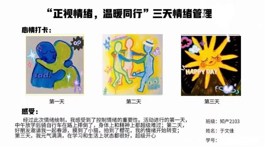 学院围绕本届心理健康节主题“爱与希望”,精心策划,开展了多项精彩有趣的活动。在“正视情绪,温暖同行”——三天情绪管理活动中,同学们精心绘制表情包,打卡心情,分享感受;在“未来邮局——写给未来自己的一封信”活动中,同学们制作画报,向未来的自己诉说心事,传递自己的期许和鼓励;在“奏响青春旋律,赏知经典电影”——心理电影观影活动中,同学们共同鉴赏了经典励志电影《当幸福来敲门》,跟随着主人翁的酸甜苦辣,时而开心、时而难过,引发对自身成长的思考。各项活动一经发布便收获了同学们的热情参与,取得了较好的反响。