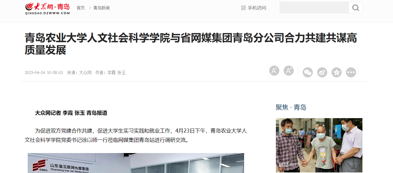 为促进双方党建合作共建,促进大学生实习实践和就业工作,4月23日下午,青岛农业大学人文社会科学学院党委书记徐以师一行莅临网媒集团青岛站进行调研交流。