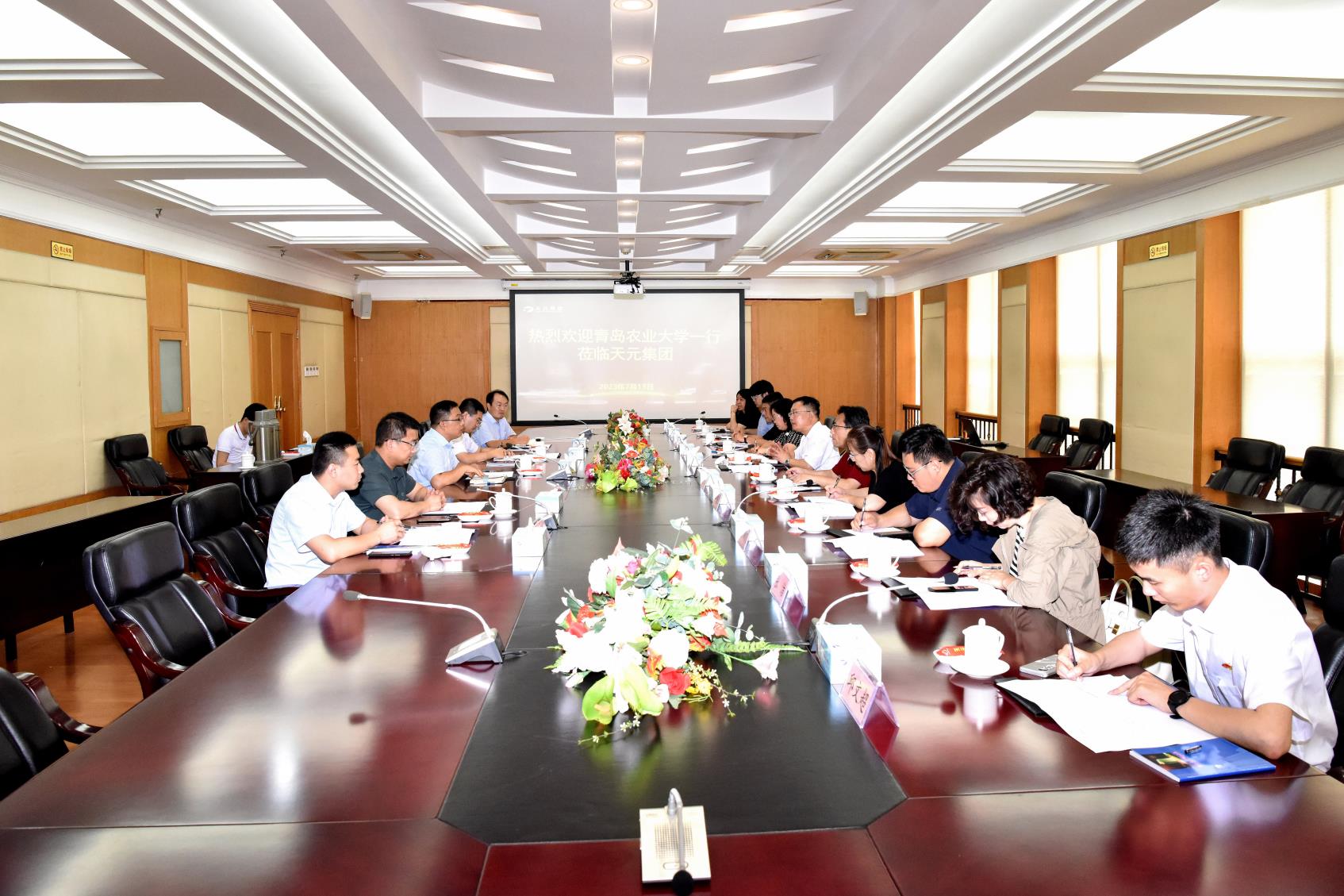 在天元集团总部,学院考察组在集团人力资源部总经理赵新明等人的带领下参观了天元集团党建展厅、企业展厅,深入了解了企业发展、人才需求、行业发展趋势等情况,随后双方进行了座谈交流。青岛农业大学校友代表、天元建设集团党群工作部部长王东振、天元物业公司副总经理石少波、天元装饰公司七项目公司副经理孙明亮先后发言,回忆在母校求学经历以及在公司成长历程。徐以师、云立新向企业介绍了学院开设专业办学情况和近年来毕业生就业情况,表达了共建合作意向。