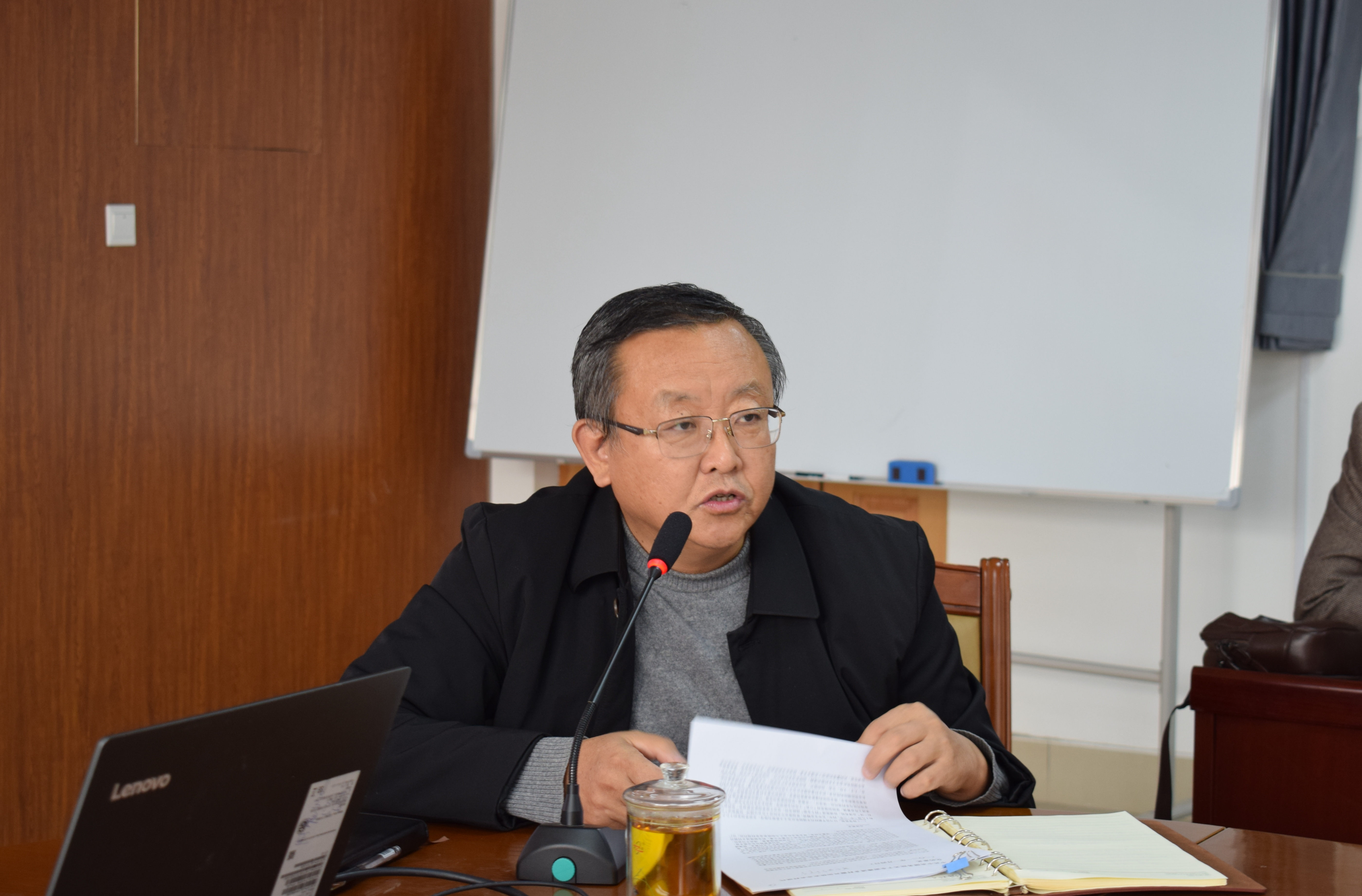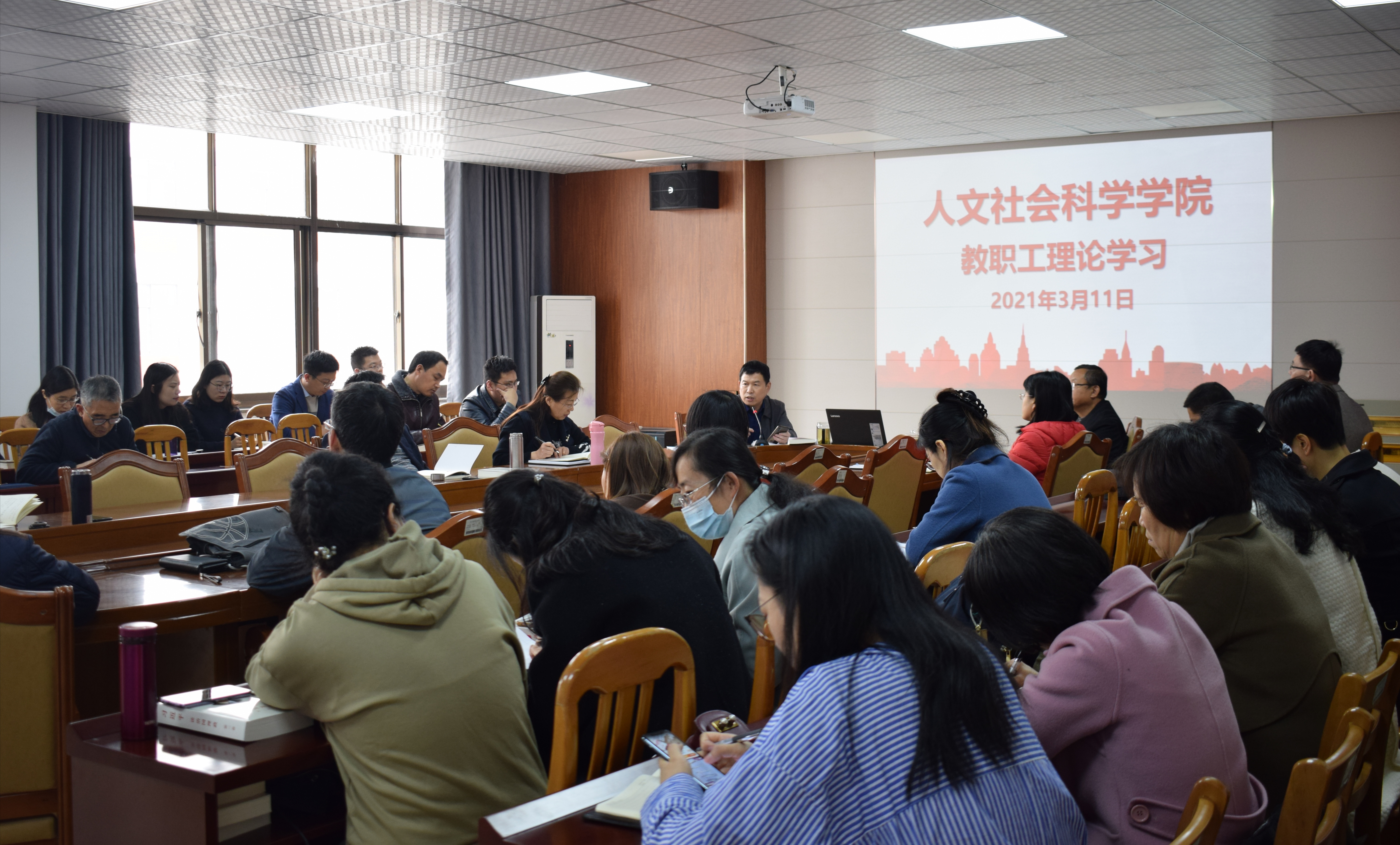 3月11日,青岛农业大学人文社会科学学院党总支书记祝茂凯主持“开学第一课”,全体教职工与会。