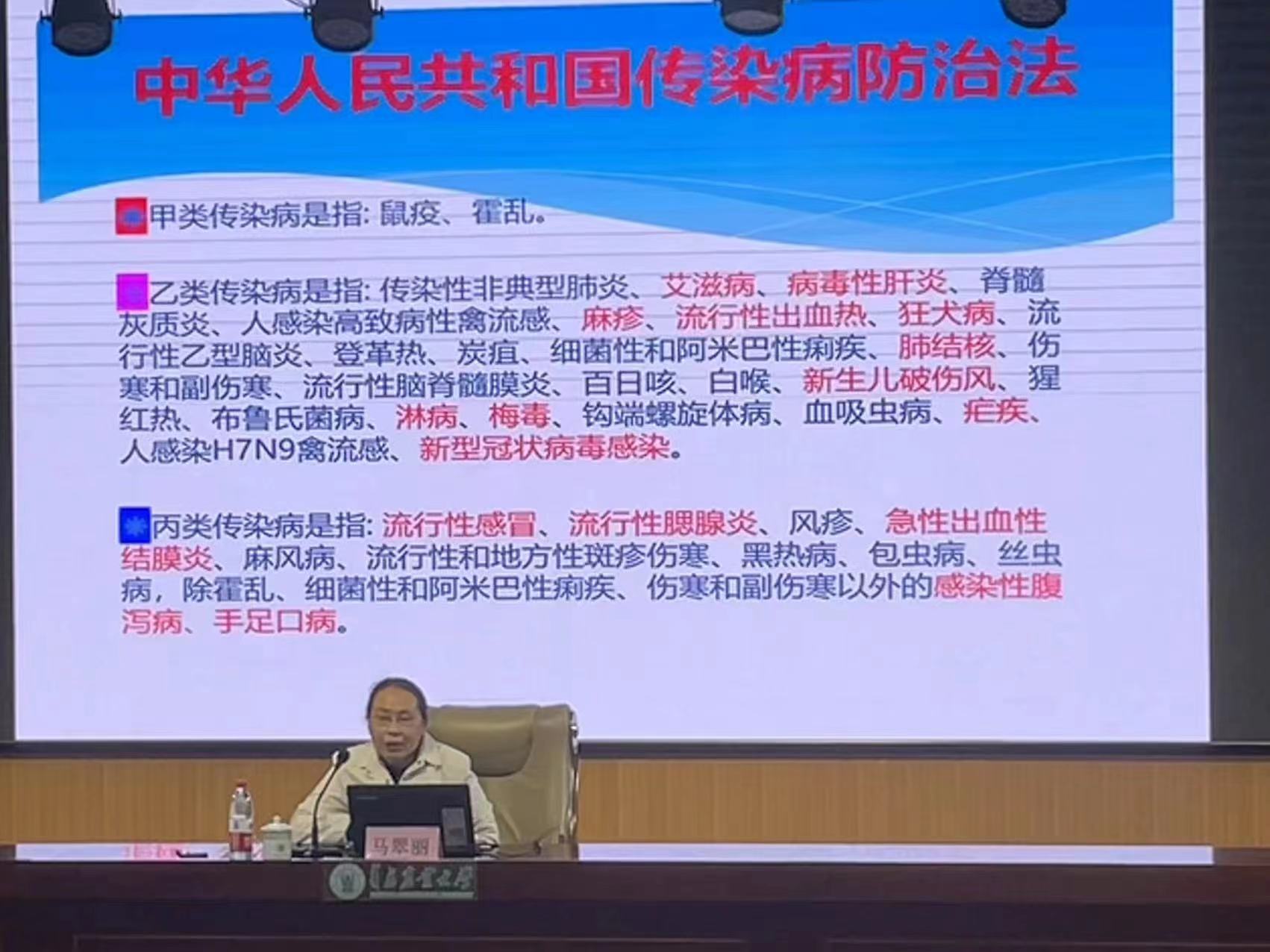 讲座开始,马翠丽首先结合实际案例和常见的几种灾害类型,讲解了十二个急救常识,指导学生在遇到中暑、骨折、蜂蛰、煤气中毒、触电、异物卡喉等情况时如何保持冷静,及时做出正确的急救措施。随后,她为同学们解读了《中华人民共和国传染病防治法》,从法律角度详细介绍了甲、乙、丙三类传染病的分类与防治,重点讲授了几种常见传染病的预防。她指出,预防传染病要落实晨、午、晚三检,严格管理病例,及时报告疫情,加强开窗通风,保持环境卫生。