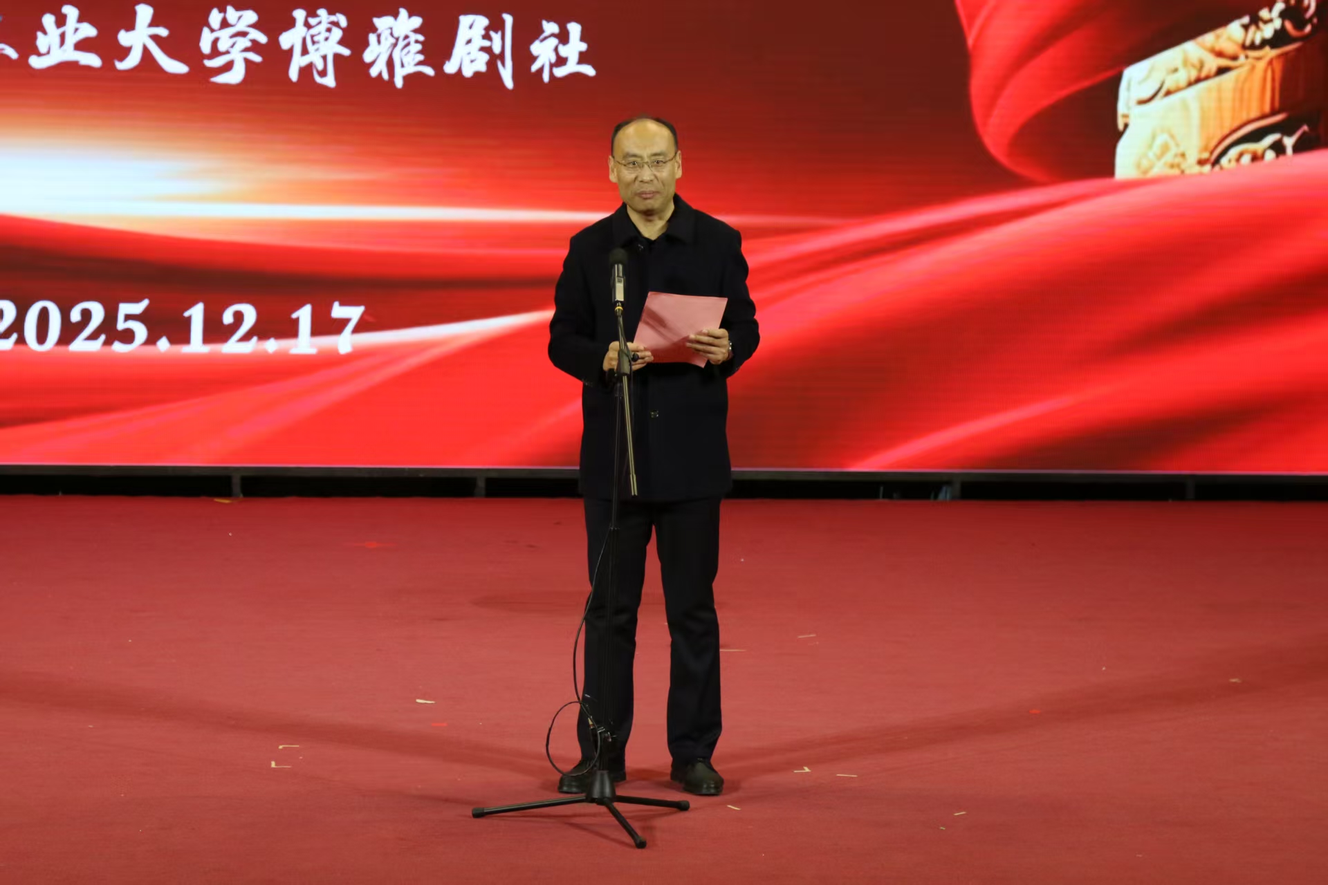 烽火映山河,丹心照汗青。为纪念抗战胜利八十周年,重温民族记忆、赓续红色血脉,12月17日,青岛农业大学人文社会科学学院“重温民族记忆——博雅剧社纪念抗战胜利八十周年话剧展演”在城阳校区演播大厅拉开帷幕。博雅剧社携《窝头会馆》与《红豆》两部话剧登台,在方寸舞台间铺展抗战岁月里中华民族的精神长卷。青岛农业大学副校长孟晓军、农业传播与教育研究院(齐民书院)院长周维维出席活动,学院党政班子成员、师生代表一起观看演出。