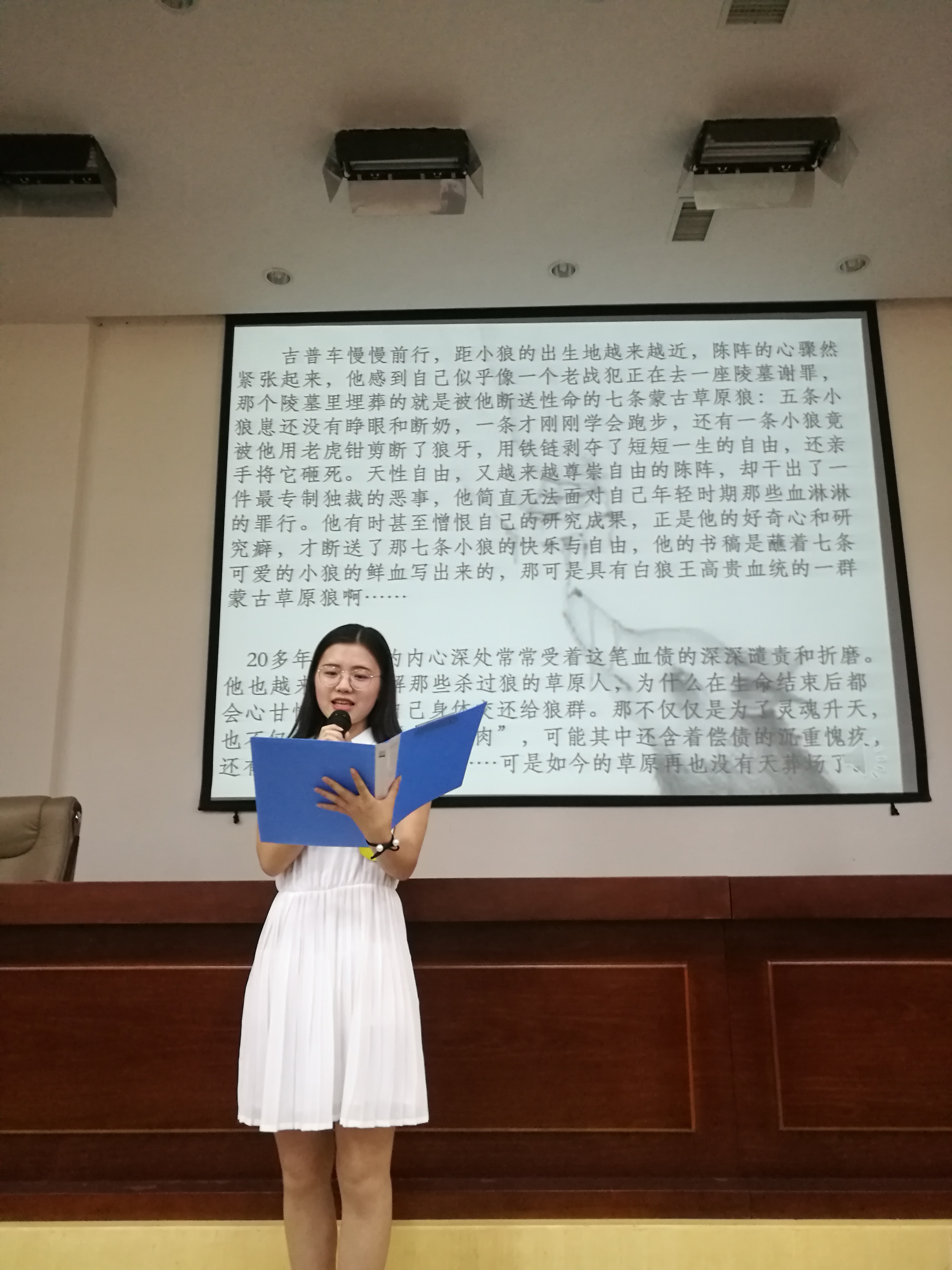 决赛分为自选篇目朗读和现场抽题的附加题朗读两个部分,选手们基本能够真挚流畅地传达作品主题与情感,部分优秀选手声情并茂,展现出了较高的朗读技巧,引领观众沉浸到了作品的情感氛围之中,观众反响热烈,掌声数次响起。经过激烈的比拼,共有12名同学分获一、二、三等奖。比赛间隙,中文专业1601武晶的舞蹈《礼仪之邦》和1602姚赛赛的歌曲《但愿人长久》,再次让观众和选手感受到了国学之美。