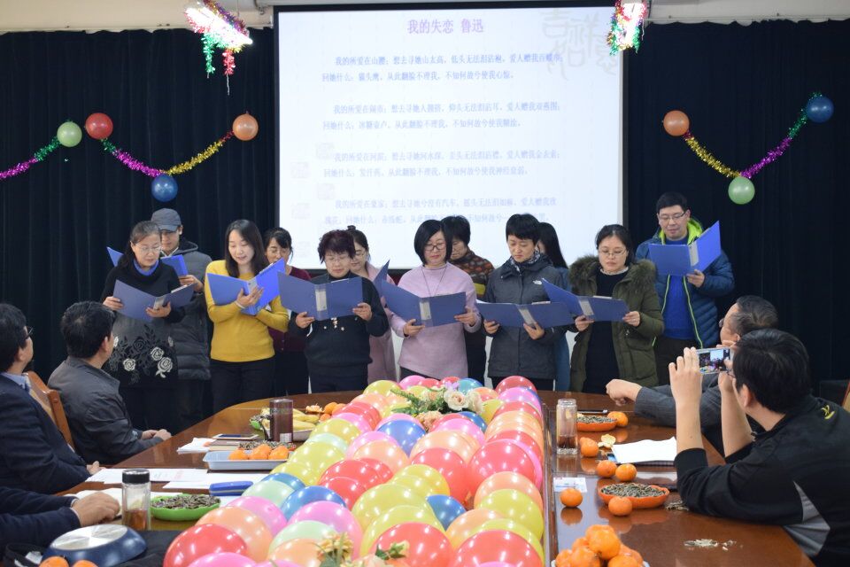 节目一开始中文教研组的老师带来了《我的失恋》、《只爱一点点》、《祝酒歌》的方言诗朗诵,一下便将现场的气氛活跃到了高潮。各地方言在诗歌中的有机结合,不仅诙谐有趣,也更添浓情,引得在座老师纷纷喝彩。