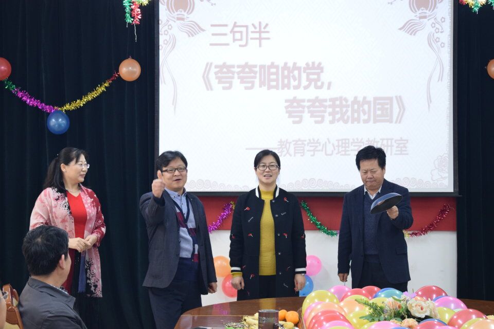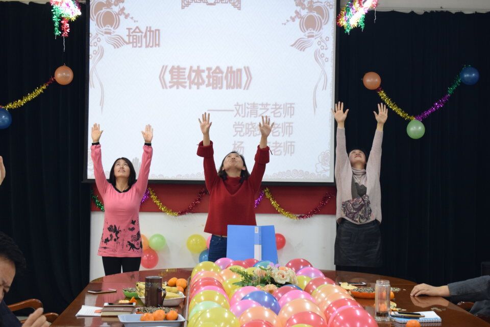 张胜芳老师带来了原创故事《少年小曹的奇幻之旅》。以生动有趣的笔风讲述了一个围绕全体老师的奇幻历险故事,引得现场一片称赞。刘清芝老师、党晓红老师、杨莉老师带来《集体瑜伽》的表演,并对老师们进行现场的教学,活动现场其乐融融。教学心理研究室也为大家带来三句半表演《夸夸咱的党,夸夸我的国》,将我国国力发展与经济腾飞微缩于小我之中,给大家带来了不一样的体验。