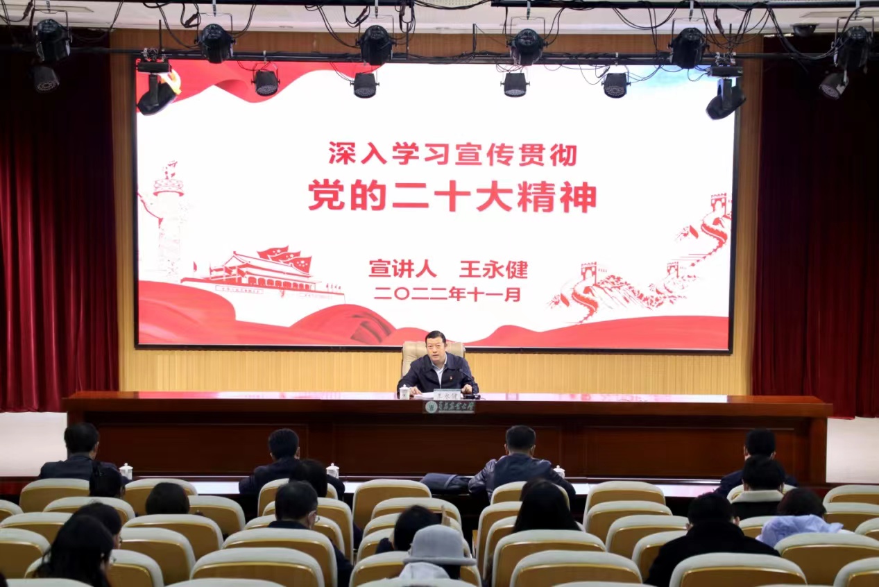 11月24日,青岛农业大学学习贯彻党的二十大精神宣讲团成员、副校长王永健在学术会馆第二报告厅为分管单位师生宣讲党的二十大精神,网络信息管理处、保卫处和人文社会科学学院全体党员和干部师生参加了宣讲会。