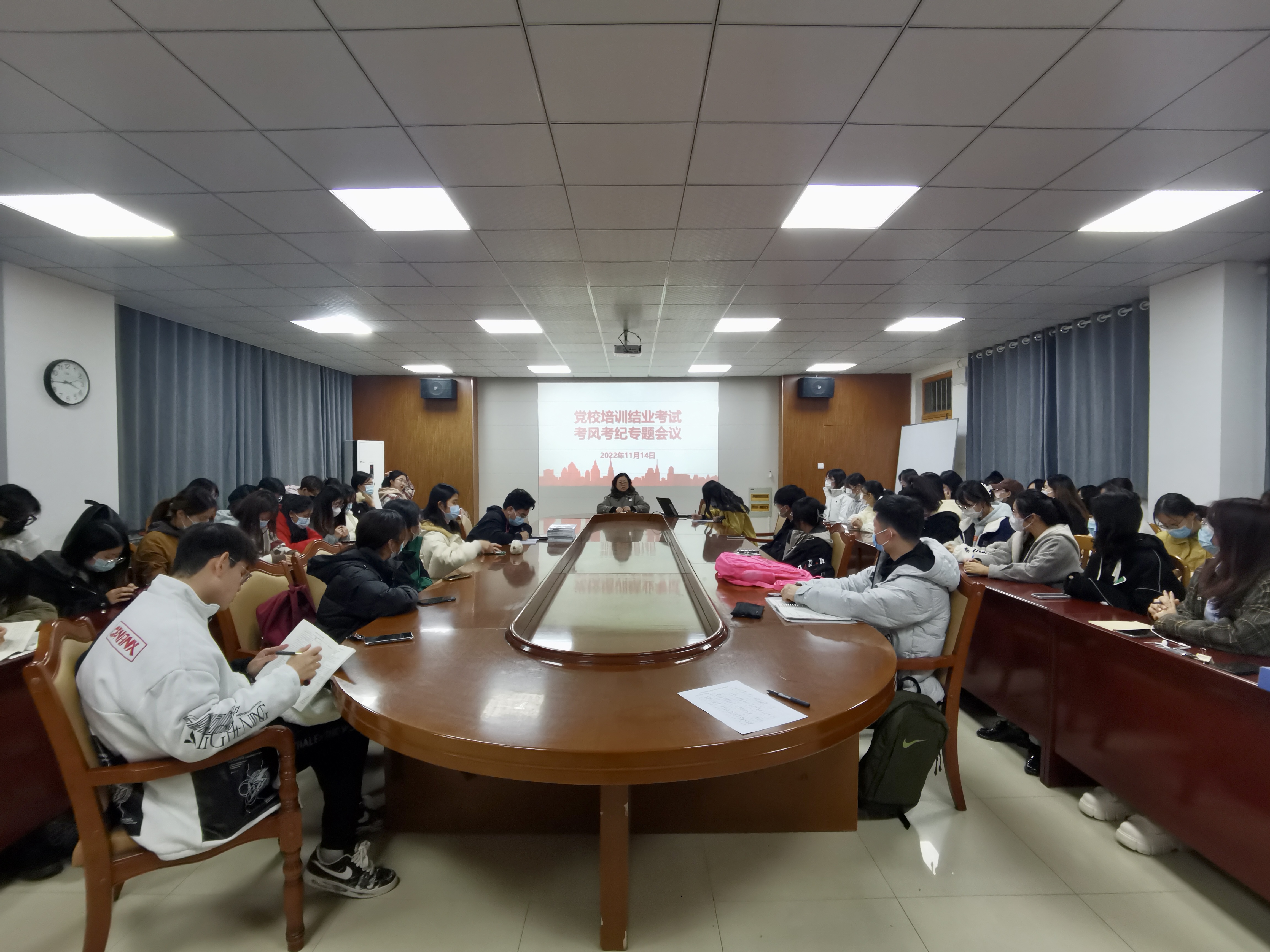 2022年11月14日,人文社会科学学院于文经楼C515会议室召开第三十一期入党积极分子和2022年下半年党员发展对象党校培训结业考试考风考纪专题会议,学院党委副书记、副院长王敬,辅导员毛凯梅参加会议。