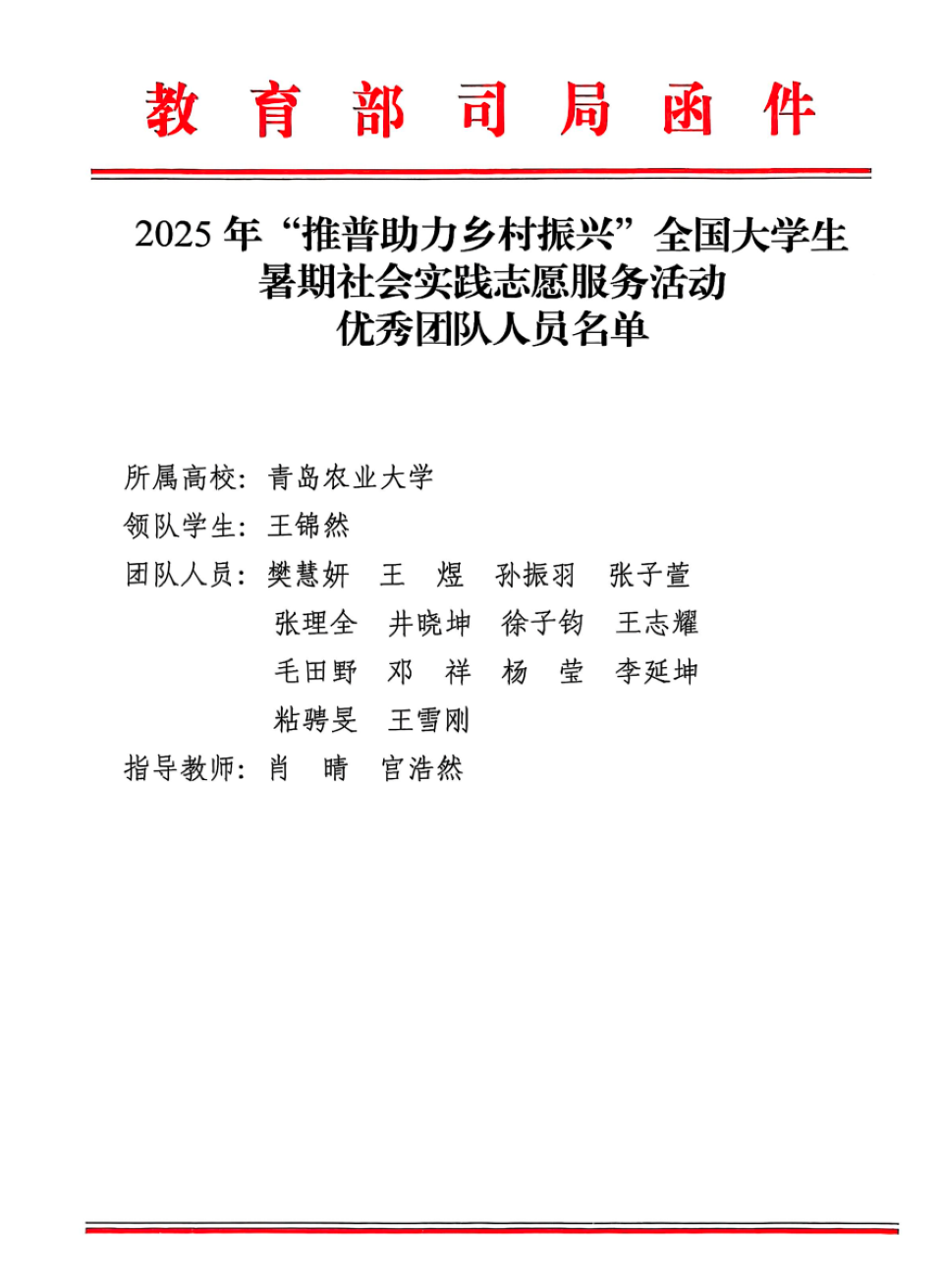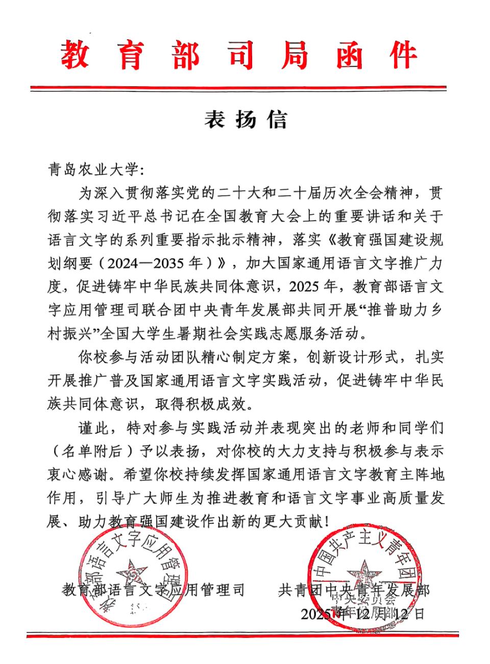 近日,青岛农业大学人文社会科学学院“普泽陇原·乡约振兴”推普实践团获评“推普助力乡村振兴”全国大学生社会实践志愿服务活动优秀团队。12月12日,教育部语言文字应用管理司、共青团中央青年发展部向学校致表扬信,对团队师生予以表扬,充分肯定了我校在推广普及国家通用语言文字实践活动,促进铸牢中华民族共同体意识等方面取得的积极成效。