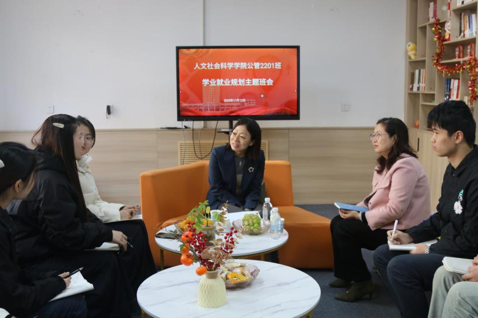 11月13日,人文社会科学学院公管2201班于城阳校区11号宿舍楼“一站式”社区召开学业就业规划主题班会。校党委委员、副校长张玉梅深入班级,与同学们亲切交流,畅谈大学生活,学院党委副书记、副院长王敬参加。