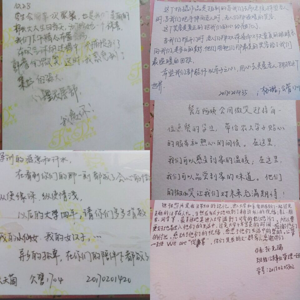 活动共征集作品90份,其中优秀作品18份。作品大多展示了同学情谊、社会温暖及闺蜜心语。“以赤子之心,用心关爱老人,拥抱这个世界”公共事业管理1701班的杨璐同学用相机记录了敬老院老人的笑容,告诉我们要留心身边的温暖与感动,以笑容面对生活并且学会给予他人温暖。公共事业管理1701班孙先瑞同学就以笑容照片的形式表白班级,给我们传递出一个“家”的温暖,渲染了一股温馨向上班级的氛围。