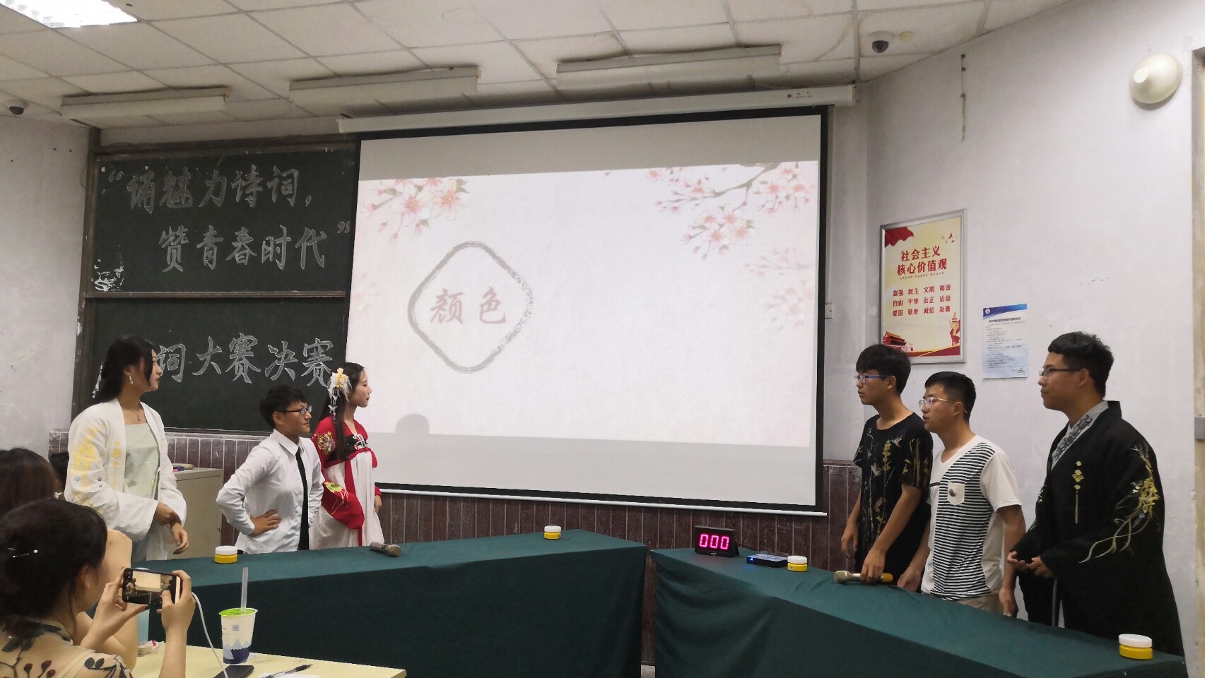 伴着《青衫薄》的音乐来到了诗词抢答环节。在本环节中,参赛选手使劲浑身解数,手持抢答器,精神高度集中,努力抢得答题权。每听到“3!2!1!请抢答!”台上、台下都屏息以待,紧张又刺激的抢答权的争取正在台上精彩的上演。而团队间的默契配合更让人惊喜连连,队员在台上的相互鼓励让这一环节在紧张之余又增添了几分温暖。