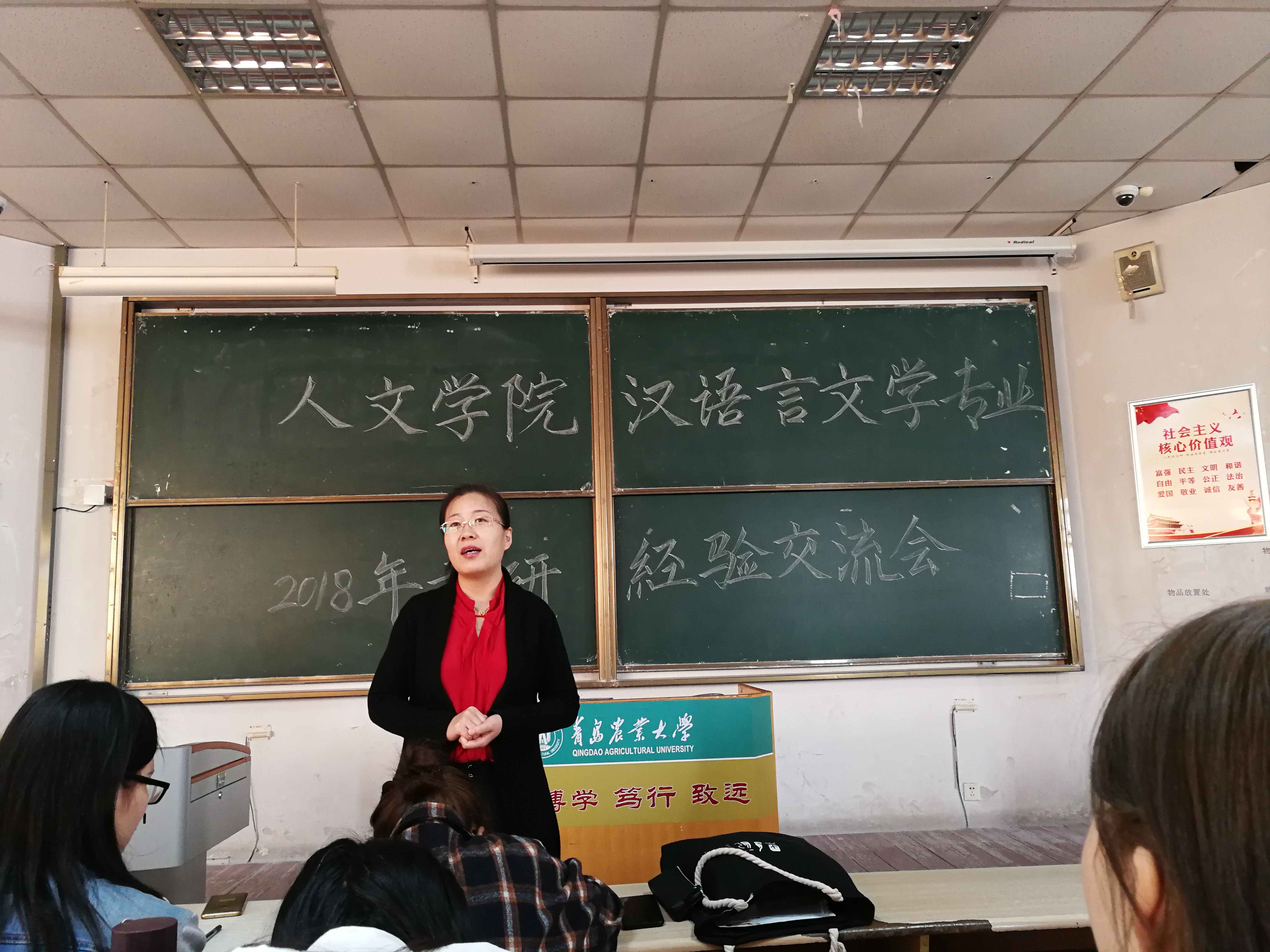 5月4日上午,青岛农业大学人文社会科学学院汉语言文学专业考研经验交流会于教学区D202举办。本次考研经验交流会邀请了2014级考研成绩优异的刘盛蕾、刘晓宇、柏晓彤、孙运平、李宗裕五位代表,与同学们交流经验,汉语言文学专业2015、2016、2017级二百余位同学前来学习交流。
