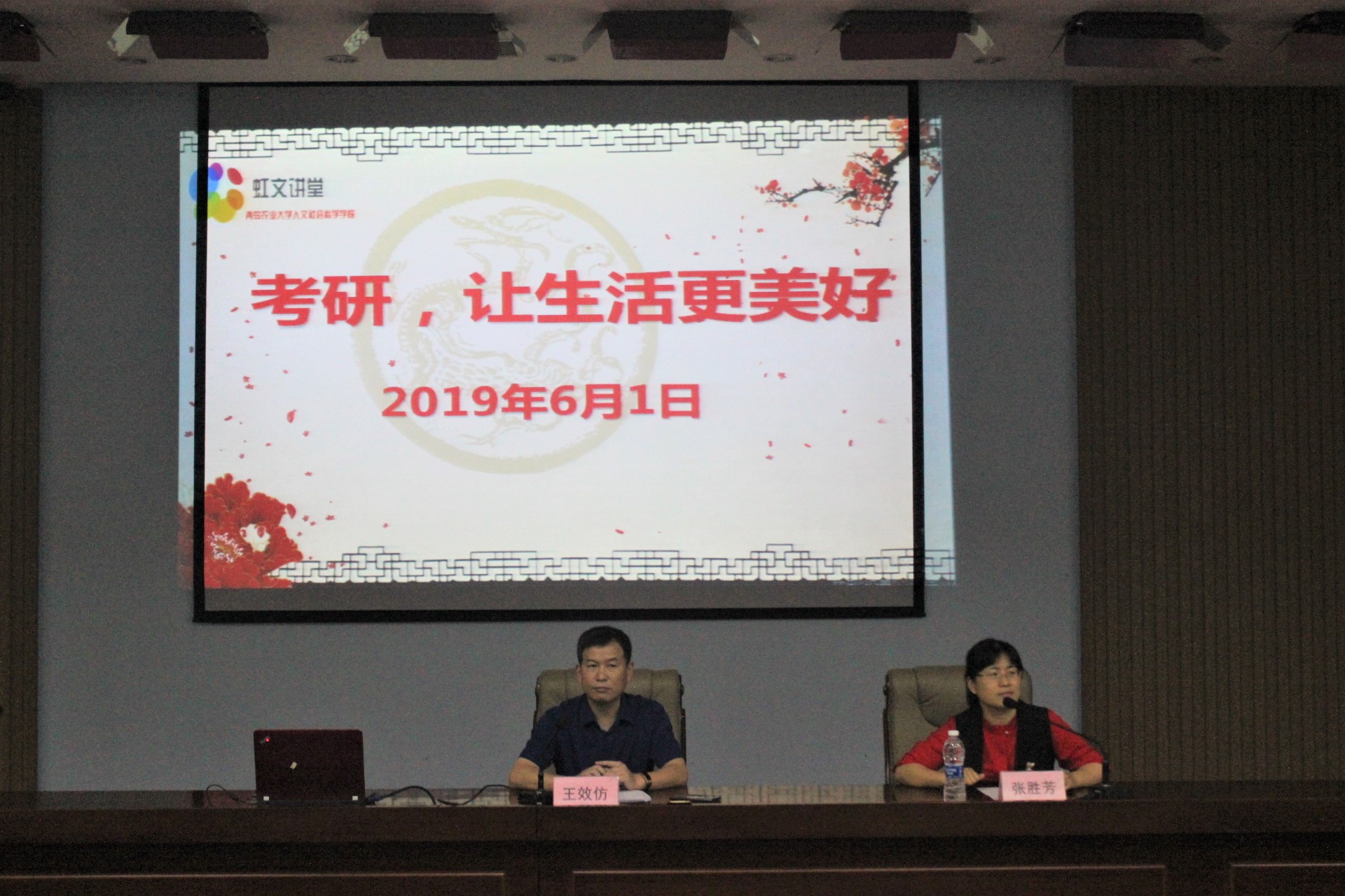 6月1日,青岛农业大学人文社会科学学院在学术会馆第三报告厅举办“考研,让生活更美好”主题考研动员大会。本次报告邀请学院院长王效仿主讲,党总支副书记、副院长张胜芳主持,2016级全体学生与会。