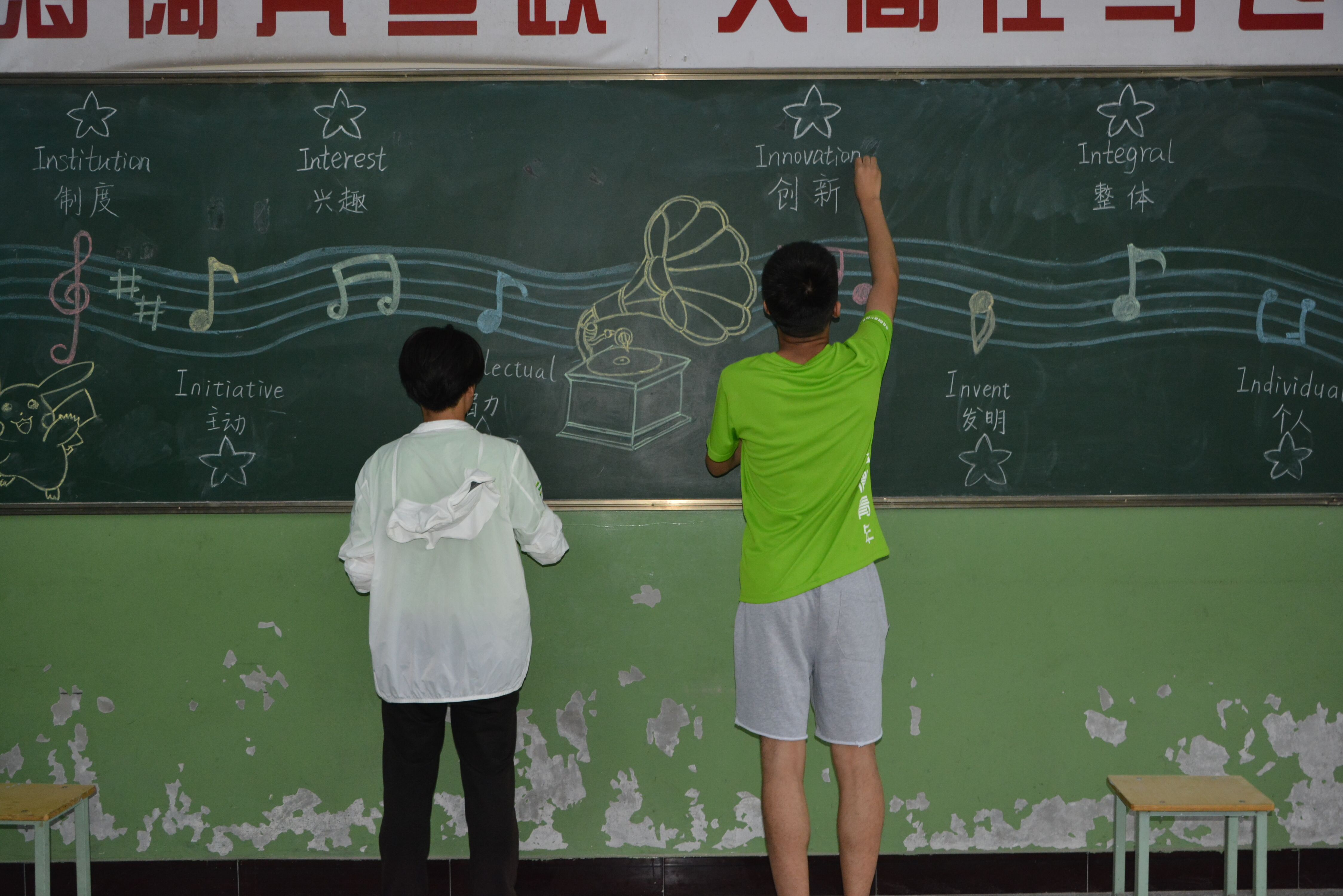 在招生之余,辅导员徐璐老师也融入大家,开始了教室黑板报的装饰工作,为小朋友们创造温馨舒适的学习乐园。“希望我的绵薄之力可以帮到大家,给孩子们留下深刻的第一印象。”徐璐边画黑板报边向队员说到。队员们也积极装饰教室的黑板,信心慢慢地开始创作黑板报,让教室更有童真的活力。彩色的粉笔在黑板上勾勒出一幅幅生动的图画,描绘了一个个熟悉的卡通人物,队员们也仿佛回到了童年,打开了回忆的阀门。