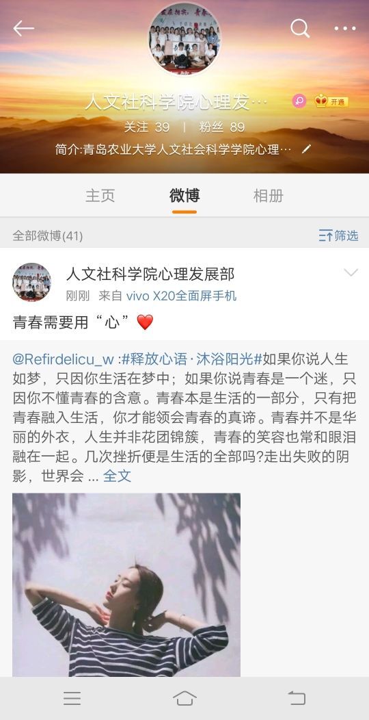 5月17日,青岛农业大学人文社会科学学院成功举办“释放心语•沐浴阳光”微博话题活动,以加强同学们之间心灵的沟通,唤起当代大学生心理健康意识。