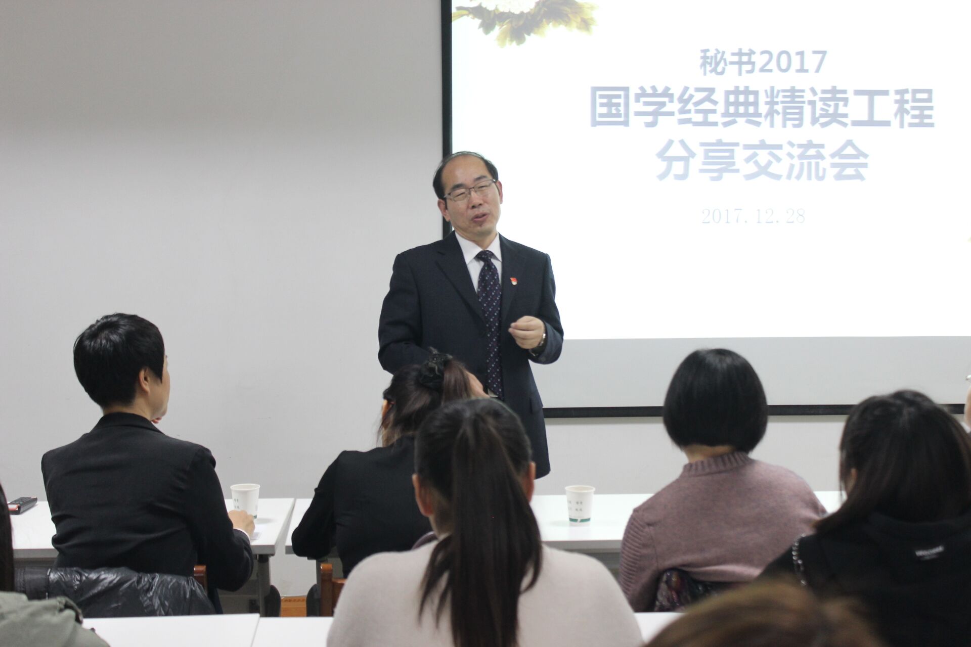 秘书2017国学经典精读工程是校纪委主持的廉洁教育项目的组成部分,本学期以来坚持每周一次的集中《论语》精读课,由学院党总支书记、班主任王仁高为学生解读《论语》各章的内涵,带领学生讨论《论语》的内容对今天人们的启发。