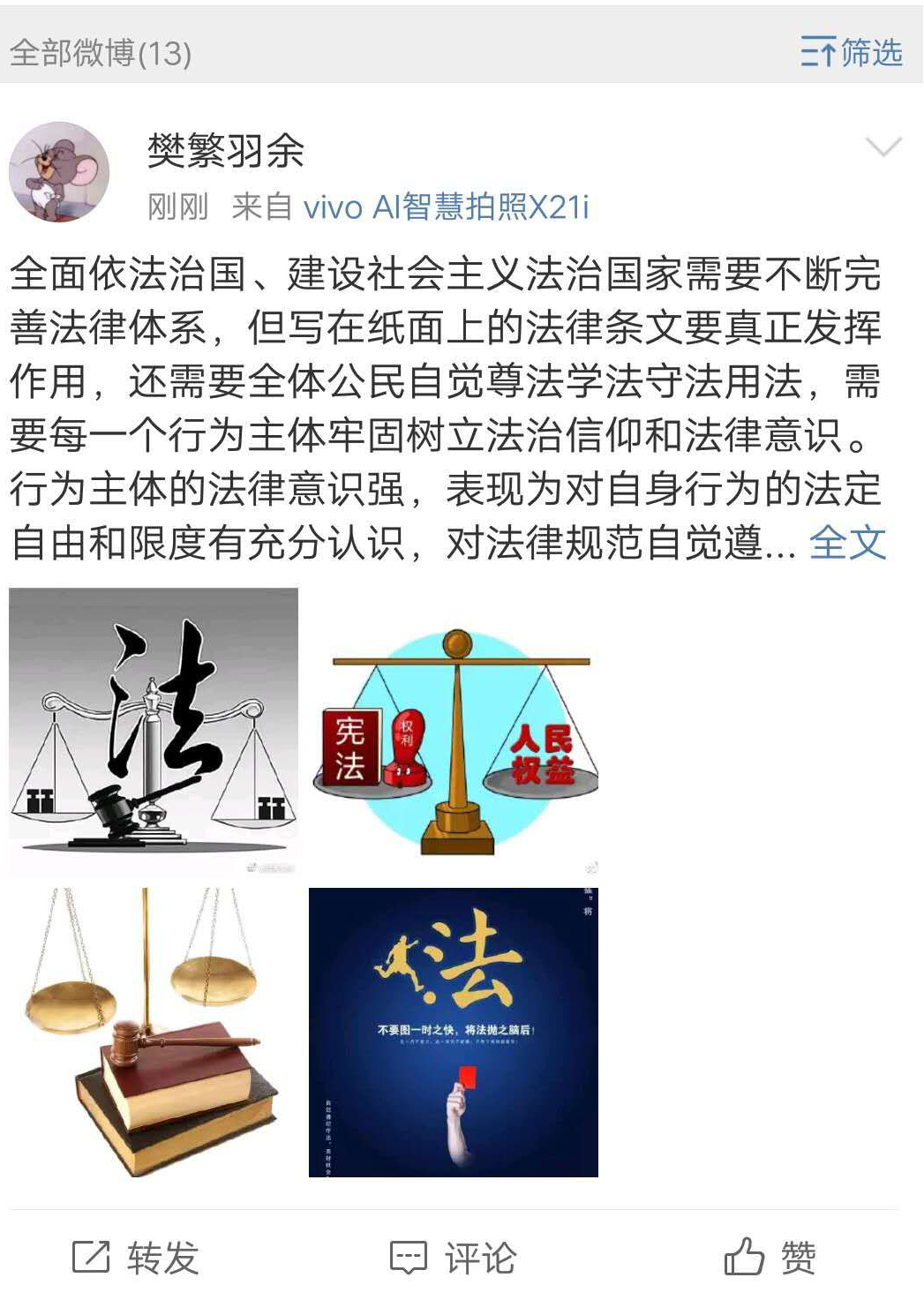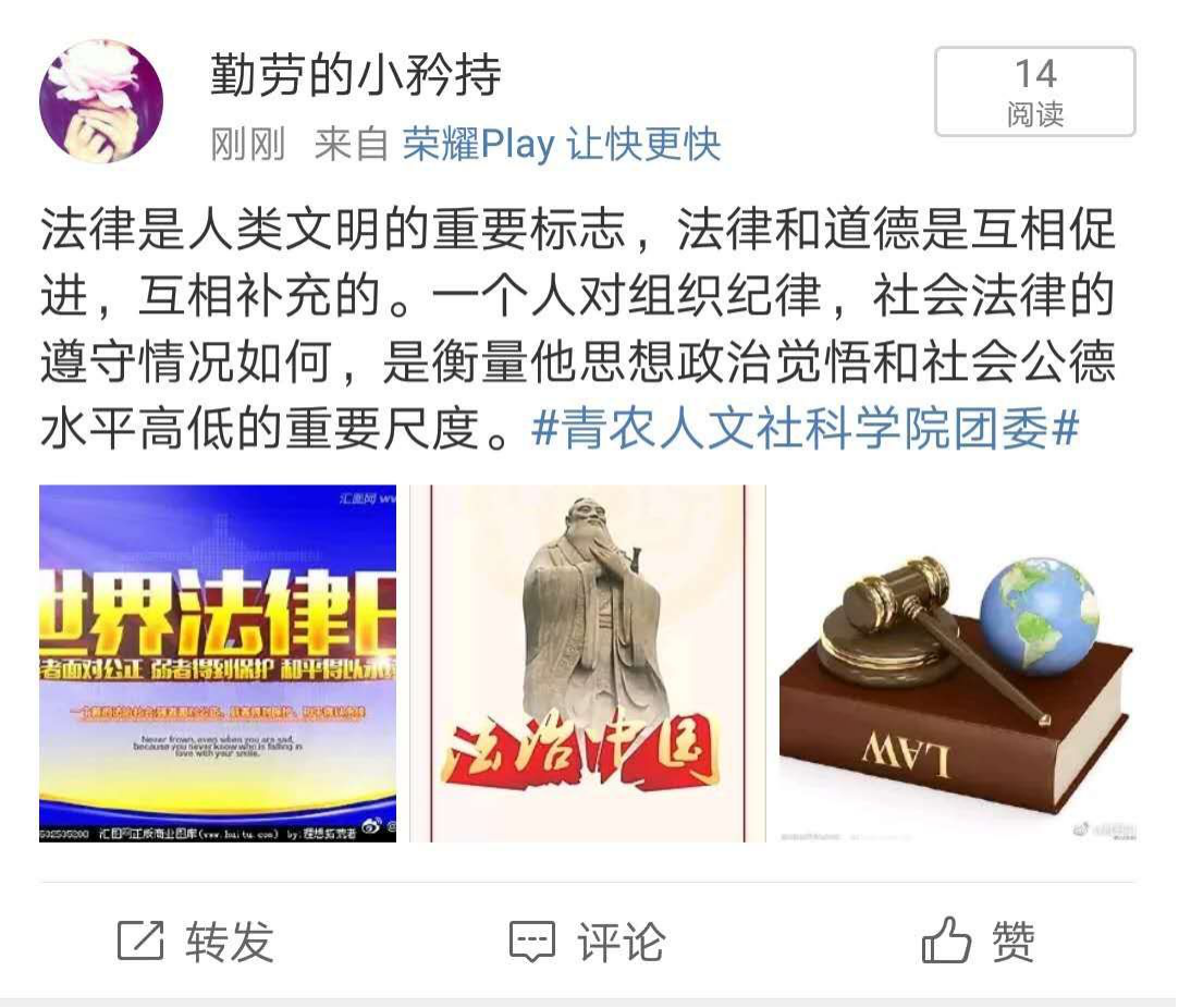 4月24至27日,人文社会科学学院举办“铭记法律,保护自我”微博话题活动,同学们的积极参与。