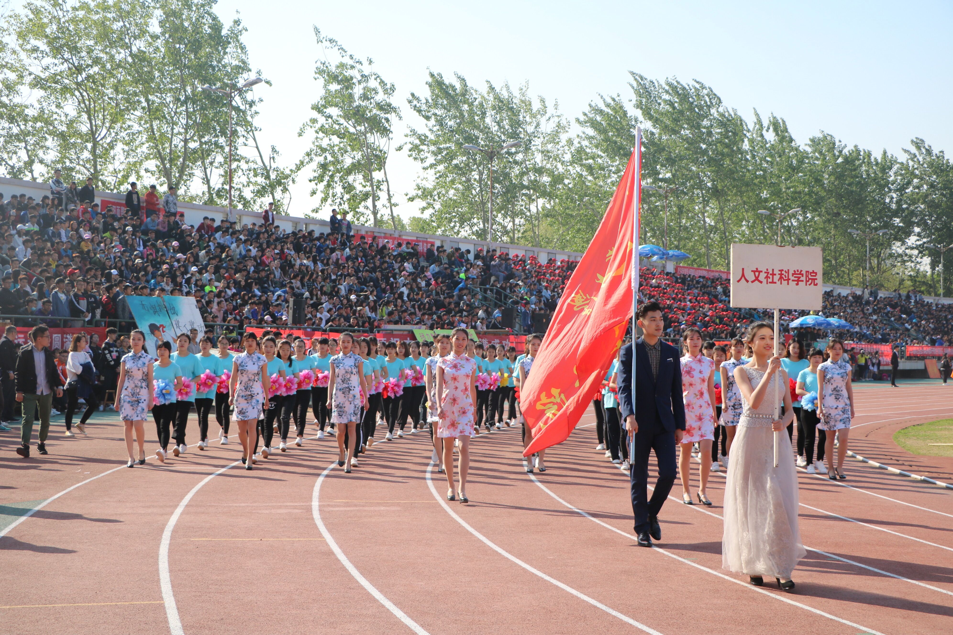 人文社会科学学院学院女子方队洋溢着青春的光芒,昂首阔步走进运动场。手持双色牡丹花的方队形成一道靓丽的风景线,高举手中的牡丹,分别拼出“花”、“开”、“人”、“文”的字样。“逐梦赛场,扬帆起航,博雅青春,花开人文!”嘹亮的口号喊出人文的博雅风采。
