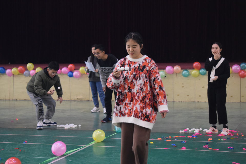 学生组的比赛同样生动激烈,选手们机智灵活、配合默契、各显所长。“男女夹球”项目中,同学们男女成队、蓄势待发,比赛哨声响起,气球爆破声跌宕起伏,欢快而热烈;“蚂蚁搬家”项目更是如火如荼,选手们手握长筷,夹起乒乓球稳中求快,顺利将球送入盆中,场下欢呼声不断;比赛来到“旱地划龙舟”场地,六人组队,队员间以彼此的手腿连接,相互配合、齐心协力、直达终点。