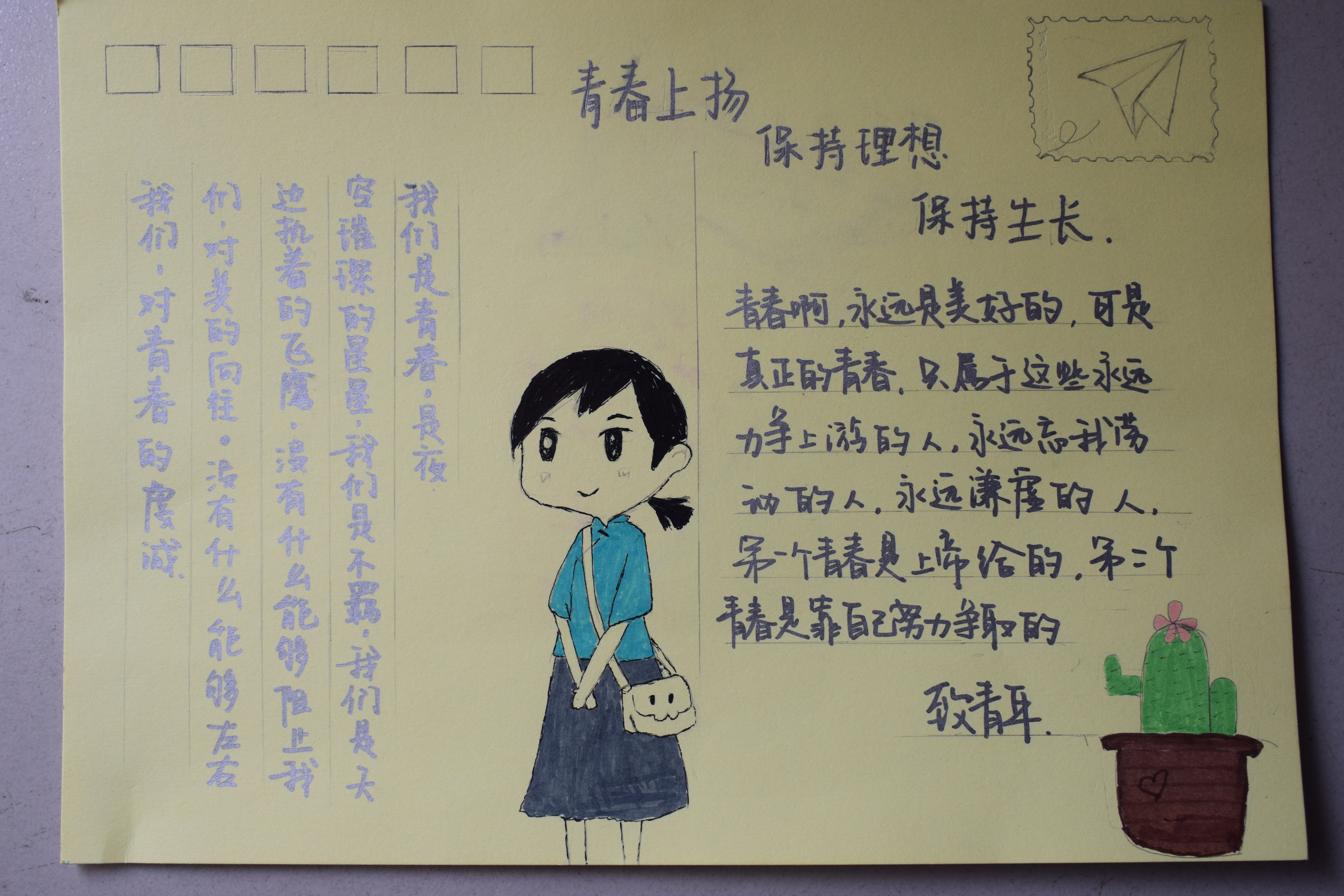 活动要求同学们利用卡纸,仿照明信片的格式,制作出一张带走自己个性的明信片,并在明信片上写下自己对五四对青春的感悟,展现自己对祖国的美好期盼。学院同学们都十分积极的参与,纷纷上交了令人称赞的作品。秘书1701班的章云峰在明信片上写道“人生需要奋斗,奋斗才会精彩”,并在明信片上绘制出了我们的国旗,给人一种大气磅礴的感觉,展现了他祖国的热爱,对未来的展望。中文1701班的任美丽同学则是绘制出了一副我们的先辈们奋勇向前的图画,光是看着,就让人热血沸腾。