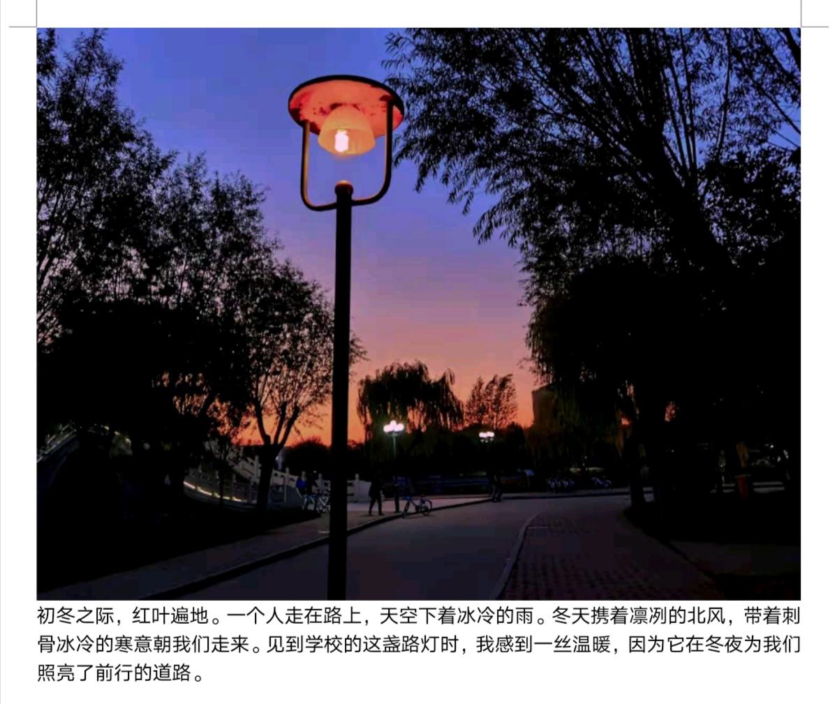 活动要求同学们以拍照的形式记录温暖的瞬间并赋文抒发感悟,得到了同学们的积极反响,纷纷上交自己的作品。汉语言文学专业2003班张韵茹同学在感悟中写道:“我决心在这悲凉中找寻暖意,忽而抬头看见枝桠凌乱重叠,又惊觉,压抑的上空,是阳光。”社会工作专业2002班张从文同学在感悟中写道:“冬天携着凛冽的北风,带着刺骨冰冷的寒意朝我们走来。见到学校的这盏路灯时,我感到一丝温暖,因为它在冬夜为我们照亮了前行的道路。”秘书专业2001班徐淑涵同学在感悟中写道:“日子是那么温柔,抬眼便是满眼温暖。”用心捕捉的照片与真挚的话语将大一同学这学期在青岛农业大学温暖的记忆清晰地呈现在作品中,展示出了自己在初冬时所遇到的温暖的点滴瞬间……本次活动共有近150名同学参加。