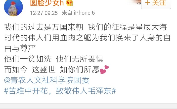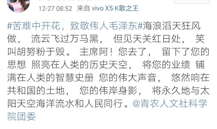 12月26日,人文社会科学学院举办“苦难中开花,致敬伟人毛泽东”线上微博话题活动。忆苦思甜,在毛主席诞辰123周年到来之际,同学们用最真挚的文字抒发对毛主席深切的缅怀之情。