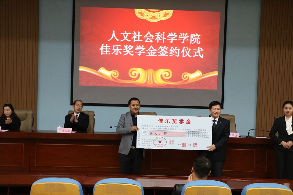 12月22日,人文社会科学学院与青岛佳乐房地产营销策划有限公司在学术会馆举行“佳乐奖学金”签约仪式。学院院长王效仿,党委书记王仁高,思政部主任、副院长修彩波出席仪式,学院正科级辅导员范楚琦主持,2016级全体学生参加会议。
