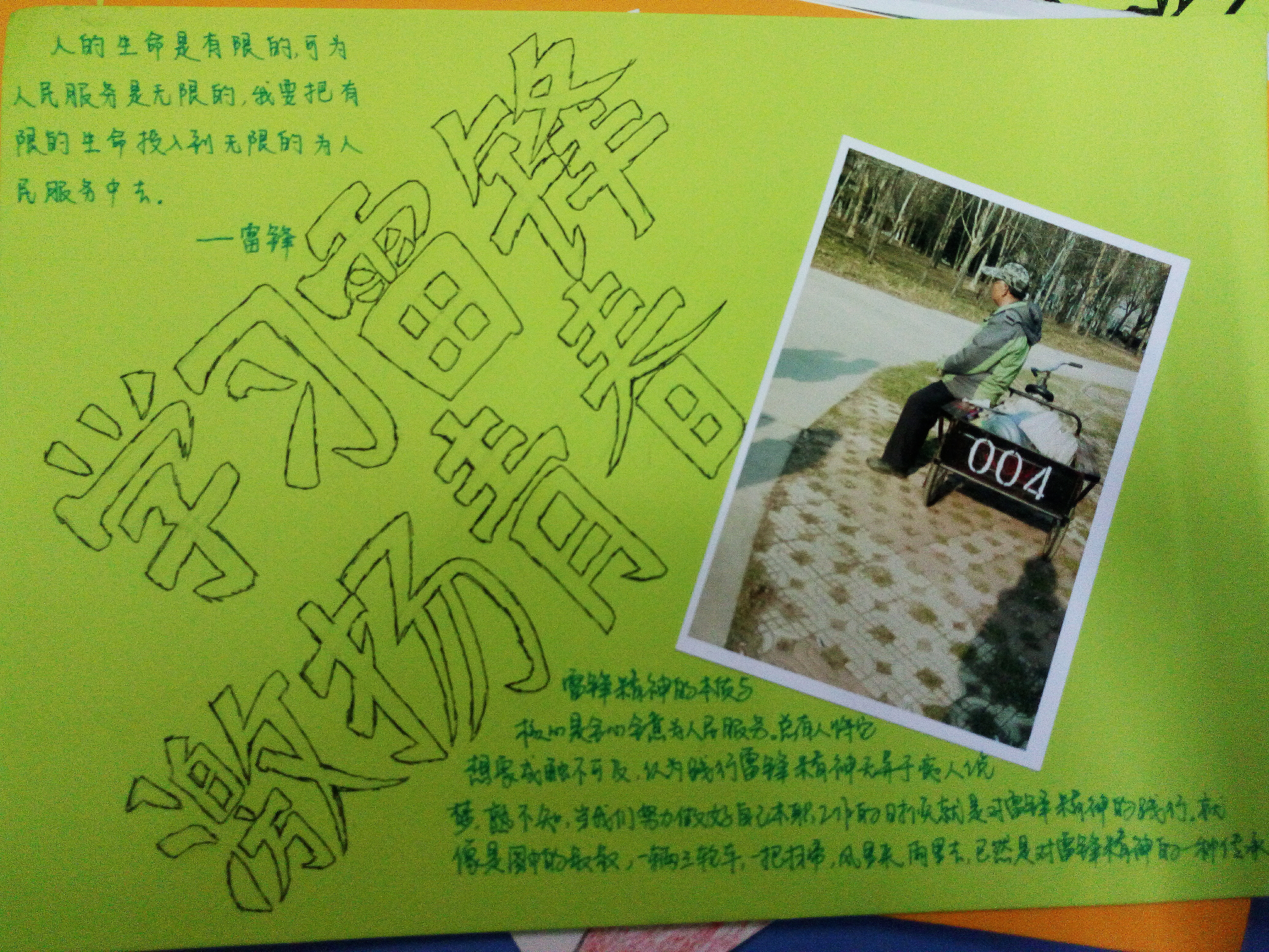 活动鼓励同学们在卡纸上写下自己对“雷锋精神”的理解,将相机拍摄的身边“好人好事”打印,并贴在卡纸上。学院筛选出优秀作品进行微博展示:虹子湖畔,正弯腰捡垃圾的是辛勤的“雷锋”;教室里,努力铲除小广告的也是“雷锋”。社会工作1602班的张伟写道,“英雄不一定是三头六臂,做事不一定要轰轰烈烈,雷锋就是平凡中的你我”。行善如登,乐善不倦。“要把有限的生命,投入到无限的为人民服务当中去”,公共事业管理1601班的张晓敏也指出,做好本职工作,就是对雷锋精神的践行。
