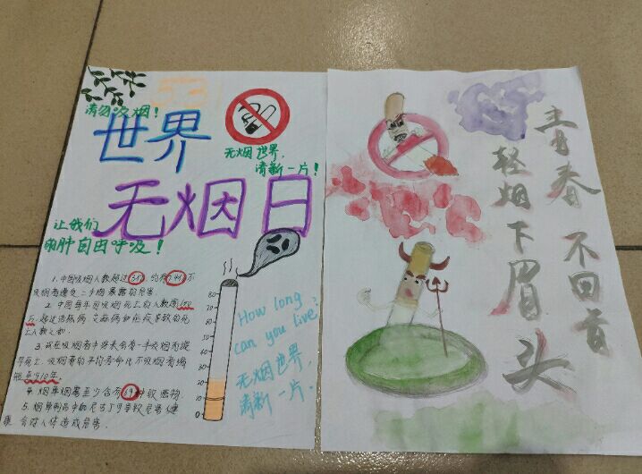 在1987年11月,世界卫生组织确立“世界无烟日”,旨在提高民众对于现有环境的意识。人文社会科学学院特举办“青春不回首,轻烟下眉头”公益广告征集活动,此次活动得到同学们的积极响应。社工1801班的王丹选择用水彩绘制公益广告,生动形象之时又凸显了禁烟主题。社工1801班的王琬琦则列举了各种数字,以真实数据展现了吸烟的危害。