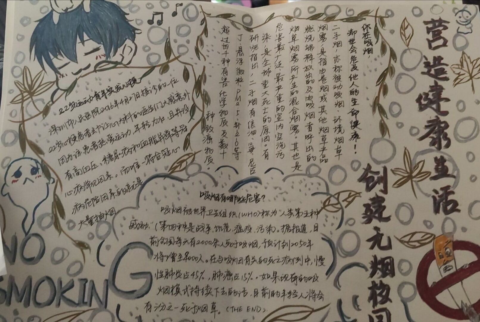 活动要求同学们以板报设计的形式将文字与插画相结合,揭露烟对人体健康和宿舍安全的危害。该活动得到了同学们积极的响应,上交了许多优秀作品。其中社工1902班的何晓霏同学在作品中提出了吸烟的危害和如何戒烟,引导同学们培养良好的生活习惯和文明的生活方式。同学们以不同的方式告诉大家创建无烟宿舍的重要性,以丰富的文字和精彩的图画表达了他们对建设文明宿舍的渴望与期待。