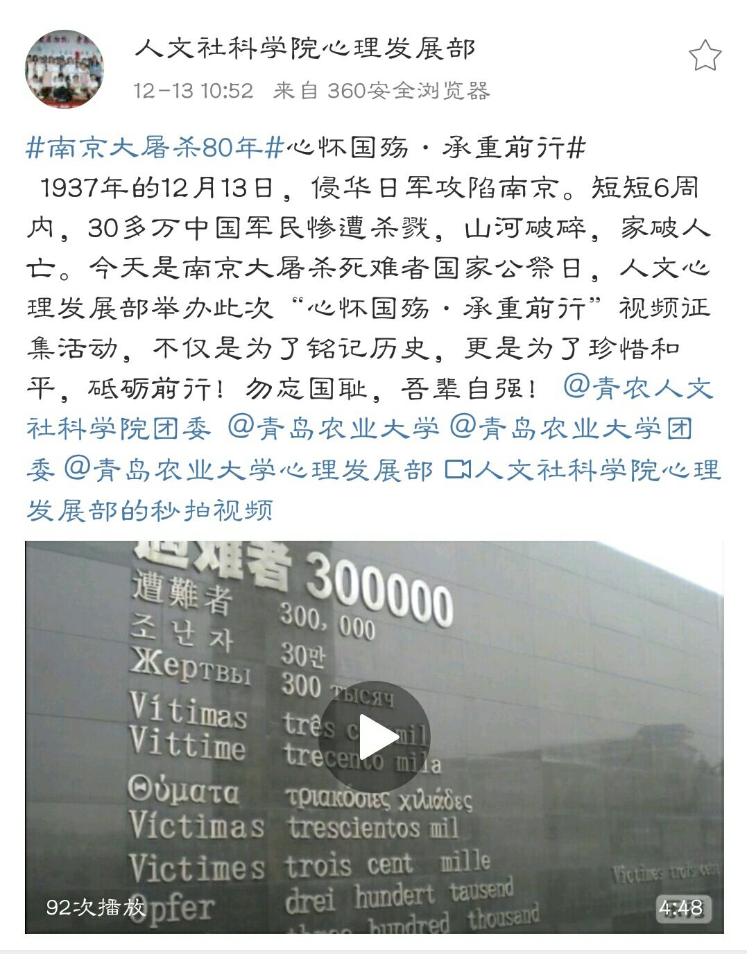 12月11日,人文社会科学学院举办"心怀国殇,承重前行"南京大屠杀视频征集活动。悼念南京大屠杀的死难者,缅怀先烈,铭记历史。