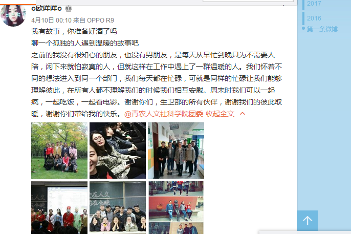 4月5日—4月12日,人文社会科学学院面向学院2015级和2016级同学举办“还想听你的故事”微博短文征集活动。通过线上微博发布的形式,为同学们提供分享自己生活经历的机会,回忆过往,用文采诉真情。