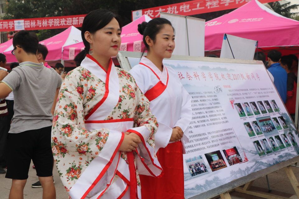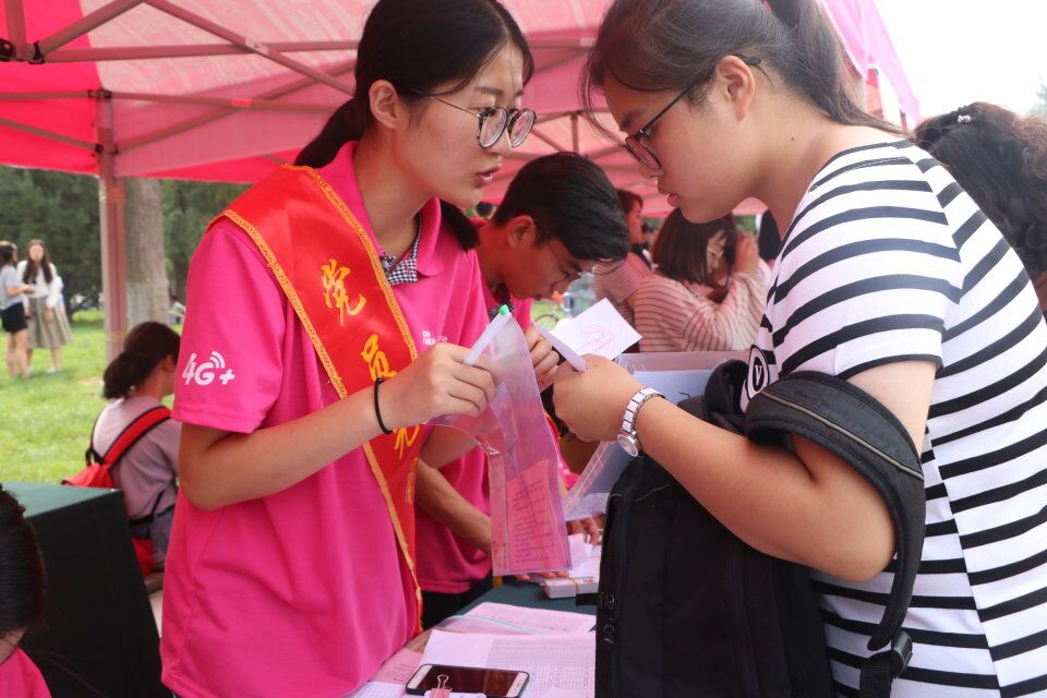 人文学院依据自身专业特色和优势,设计了特色展板、温馨书签、传统礼仪展示等一系列具有深厚人文底蕴的迎新活动。一梦四年、考研风采、博雅人文,与妙墨处方见人文。三块类别不同、各具特色的展板,为新生提供了全方位了解学院信息的平台;枚枚书签上一行行温情动人的祝福语,蕴含着人文学子之间永恒的真爱情结,从细节处帮助新生前行;人文礼仪姑娘们个个眉梢眼角藏秀气,声音笑貌露温柔,身着对襟襦裙,亭亭玉立。她们向每一位新生送上灿烂笑意,在展现人文特色的同时,更加弘扬了中华优秀传统文化。