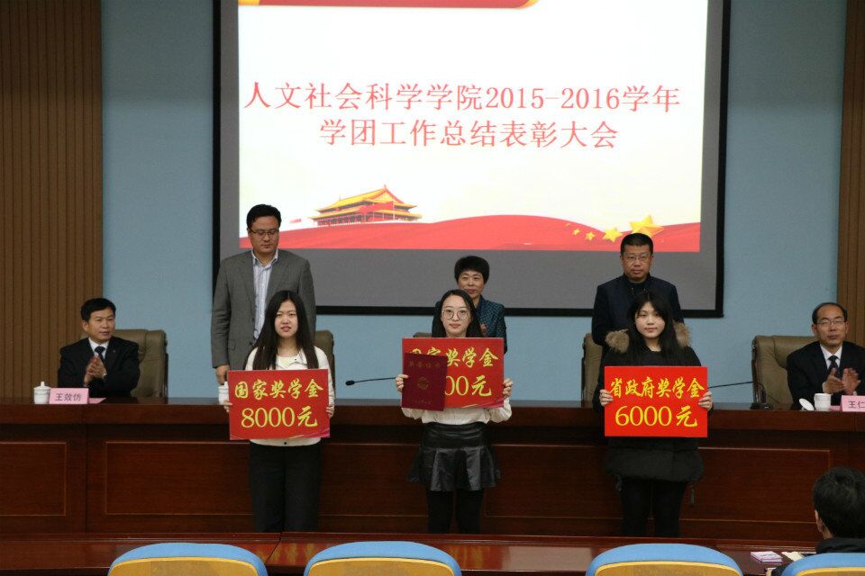 12月22日晚,人文社会科学学院2015-2016学年学团工作总结表彰大会于学术会馆举行。校党委委员、纪委书记刘明瑛,校学工部(处)部长王清春,校团委书记王峰,学院党委书记王仁高,院长王效仿,思政部主任、学院副院长修彩波,学院学工办全体成员及部分班主任出席了本次会议。大会由学院正科级辅导员范楚琦主持,2016级全体学生及部分受表彰学生参加了会议。